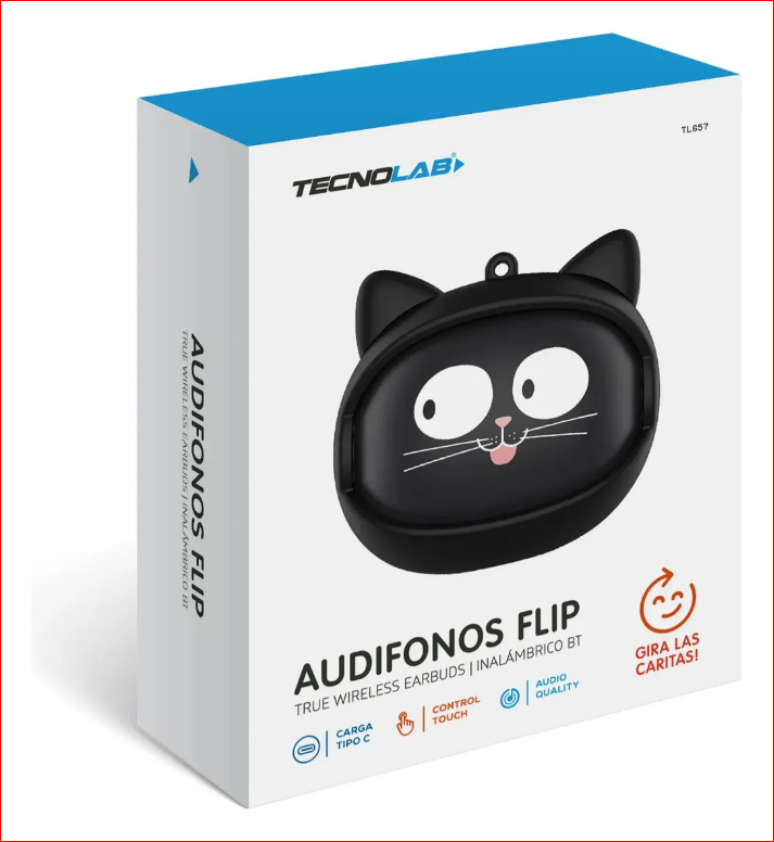 Disfruta tu música, videos y llamadas con los Audífonos Flip Tecnolab inalámbricos BT, diseñados para destacar por su estilo único y práctico. Este modelo cuenta con un estuche llamativo con diseño de gatito negro y carita giratoria, perfecto para quienes quieren un accesorio diferente, moderno y divertido.